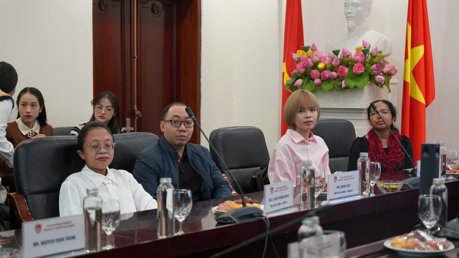 TS. Đào Thị Tuyết Nhung (áo xanh) - Phó Viện trưởng Viện Đào tạo Quốc tế cùng GS. Sudipta Roy và TS. Nguyễn Thị Phương Anh - Điều phối viên USF tại Hà Nội tại sự kiện