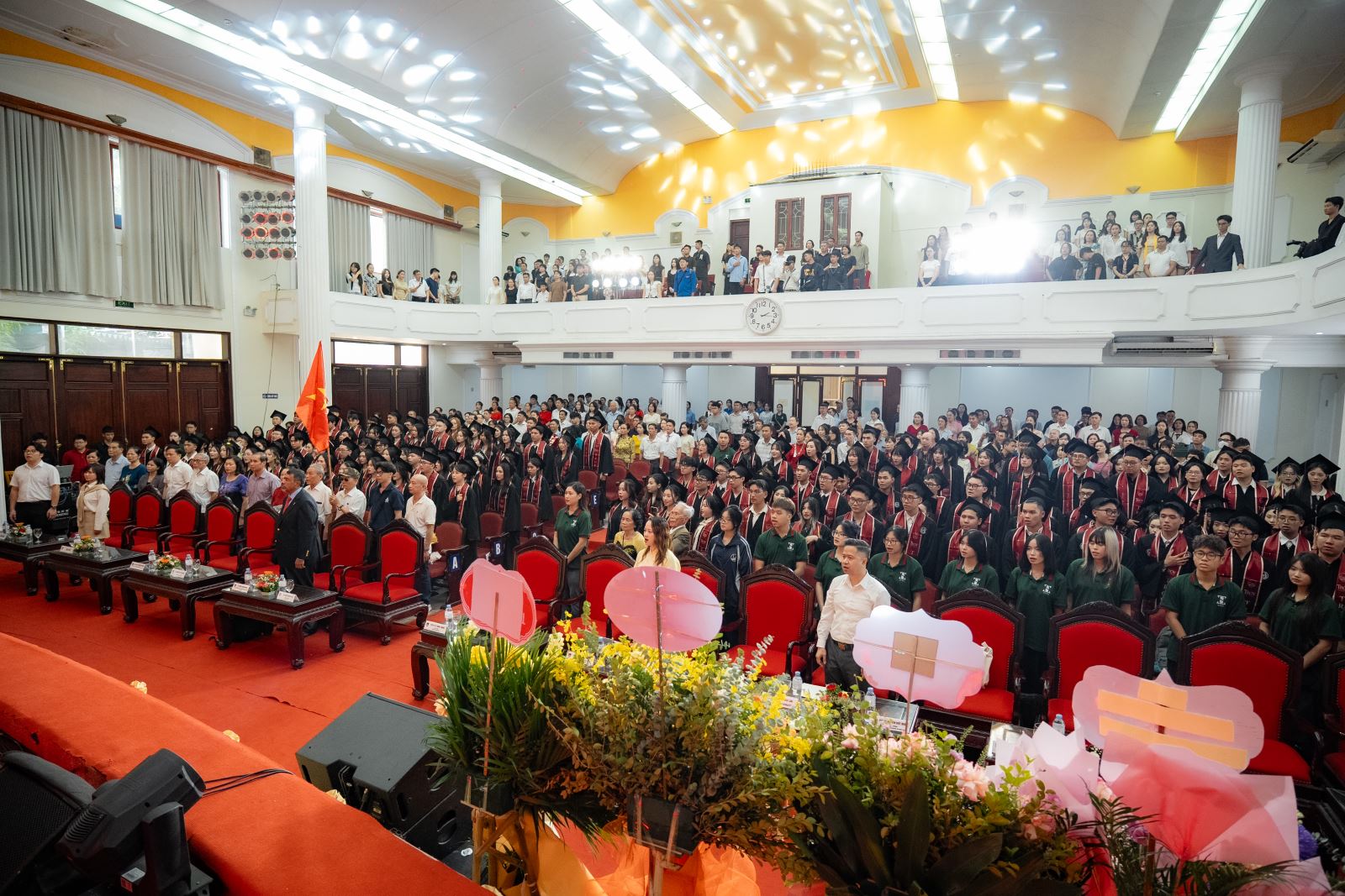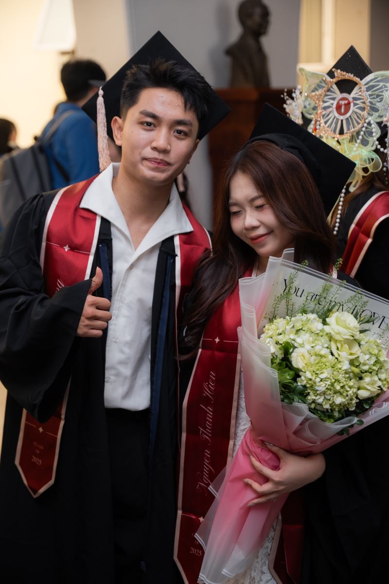 Ngay từ đầu giờ chiều, hội trường Nguyễn Văn Đạo đã tràn ngập sắc màu của lễ tốt nghiệp. Những gương mặt rạng rỡ của phụ huynh, bạn bè, và đặc biệt là các tân cử nhân trong bộ lễ phục tốt nghiệp đã tạo nên một khung cảnh vừa thiêng liêng, vừa tự hào. Mỗi bước chân tiến vào hội trường là một hành trình ký ức – của bốn năm nỗ lực không ngừng, của những đêm thức trắng cùng bài luận, của những dự án nhóm đầy thử thách và những khoảnh khắc vỡ òa khi chạm tới thành công.