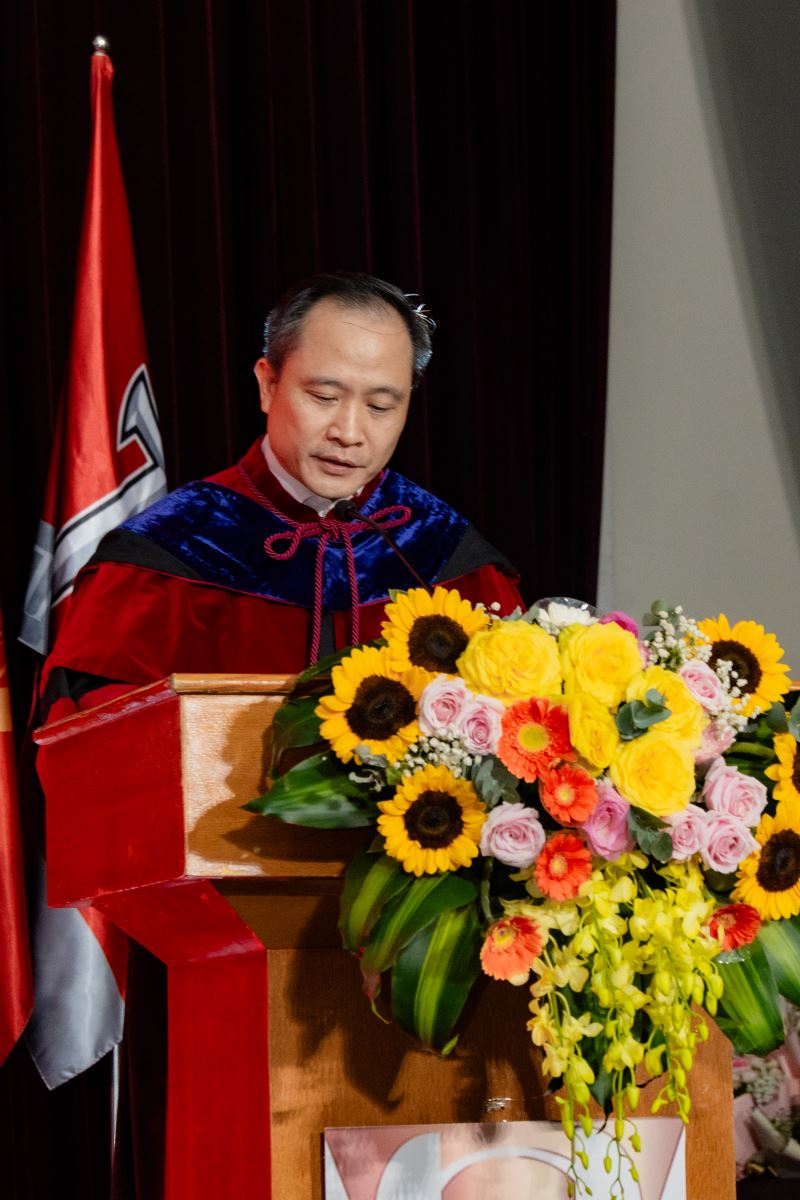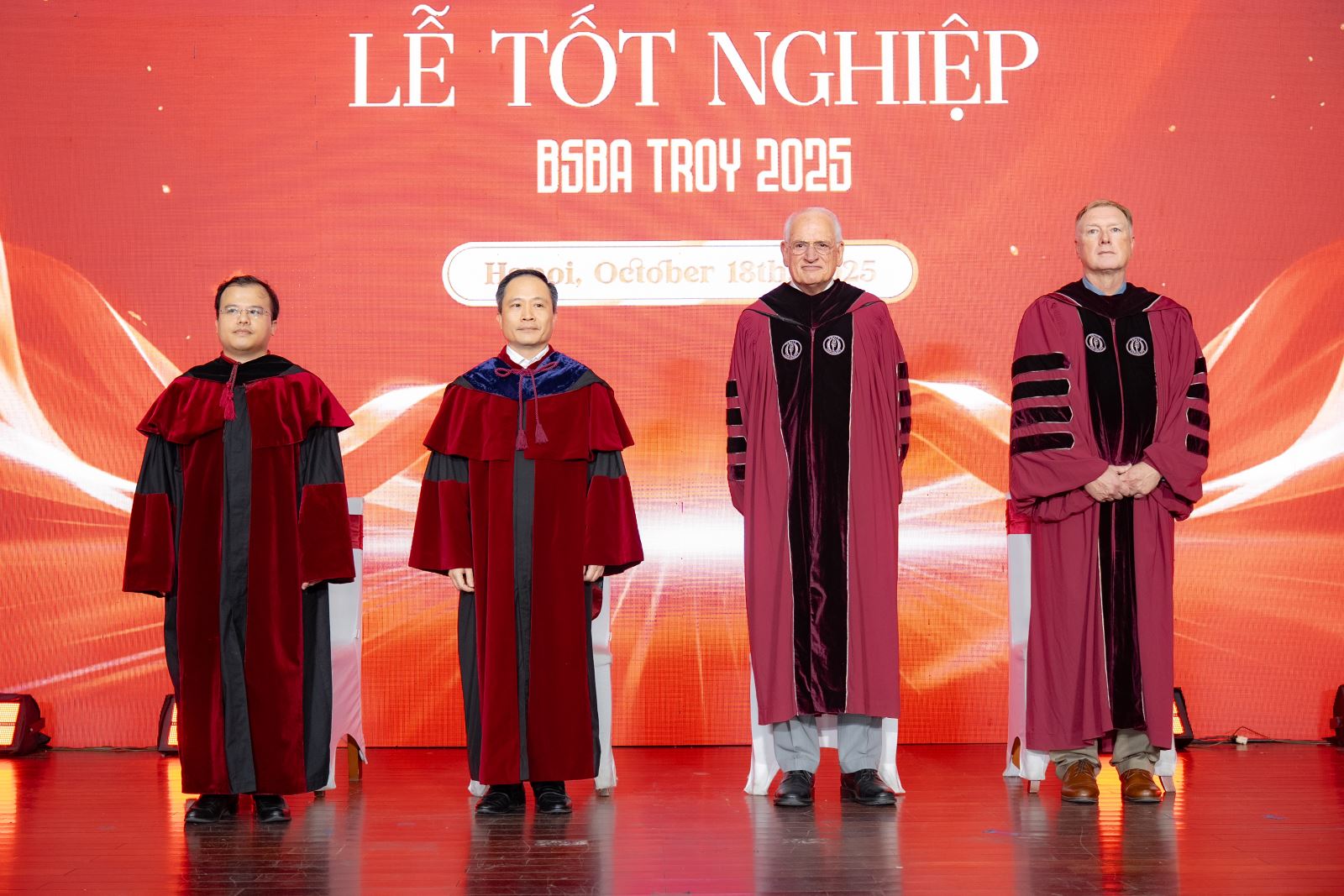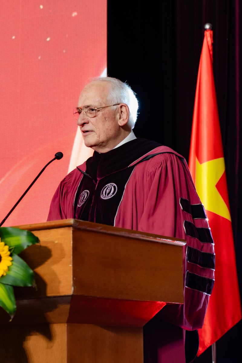 Tiếp đó, GS Jack Hawkins – Hiệu trưởng Đại học Troy, Hoa Kỳ gửi lời chúc mừng với thông điệp mang đậm tinh thần Trojans never quit – “Một Trojan thực thụ không bao giờ bỏ cuộc.” Ông nhấn mạnh rằng: “Giáo dục là tấm hộ chiếu cho tương lai, và hôm nay, các em đã sẵn sàng mang tấm hộ chiếu ấy ra thế giới.”