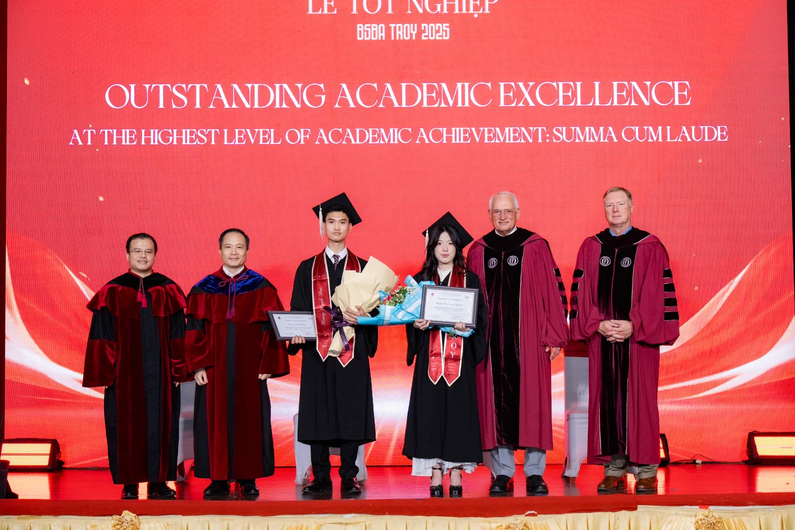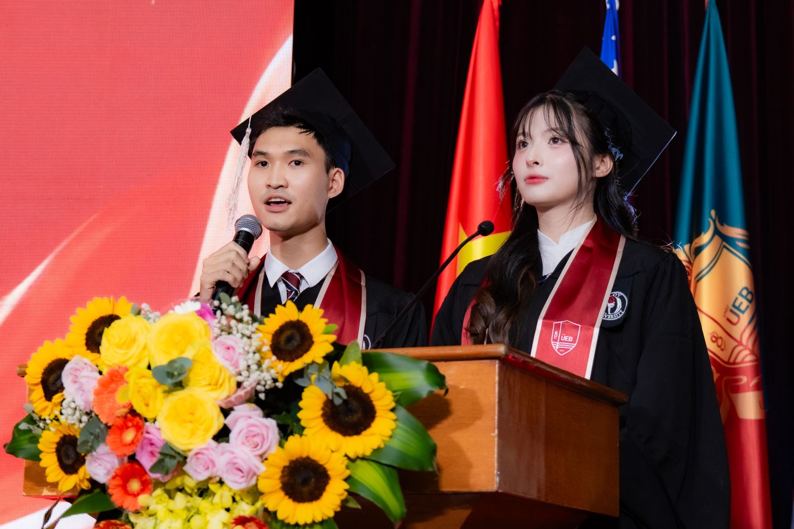 Khoảnh khắc hai đại diện tân cử nhân Khóa 20 phát biểu là một điểm lắng đọng đầy xúc động. Hoàng Danh Đức và Nguyễn Thanh Huyền chia sẻ rằng: “Chúng em đến với chương trình BSBA Troy không chỉ để học, mà để học cách trở thành những công dân toàn cầu – dám nghĩ, dám làm, dám chịu trách nhiệm với chính lựa chọn của mình.”
