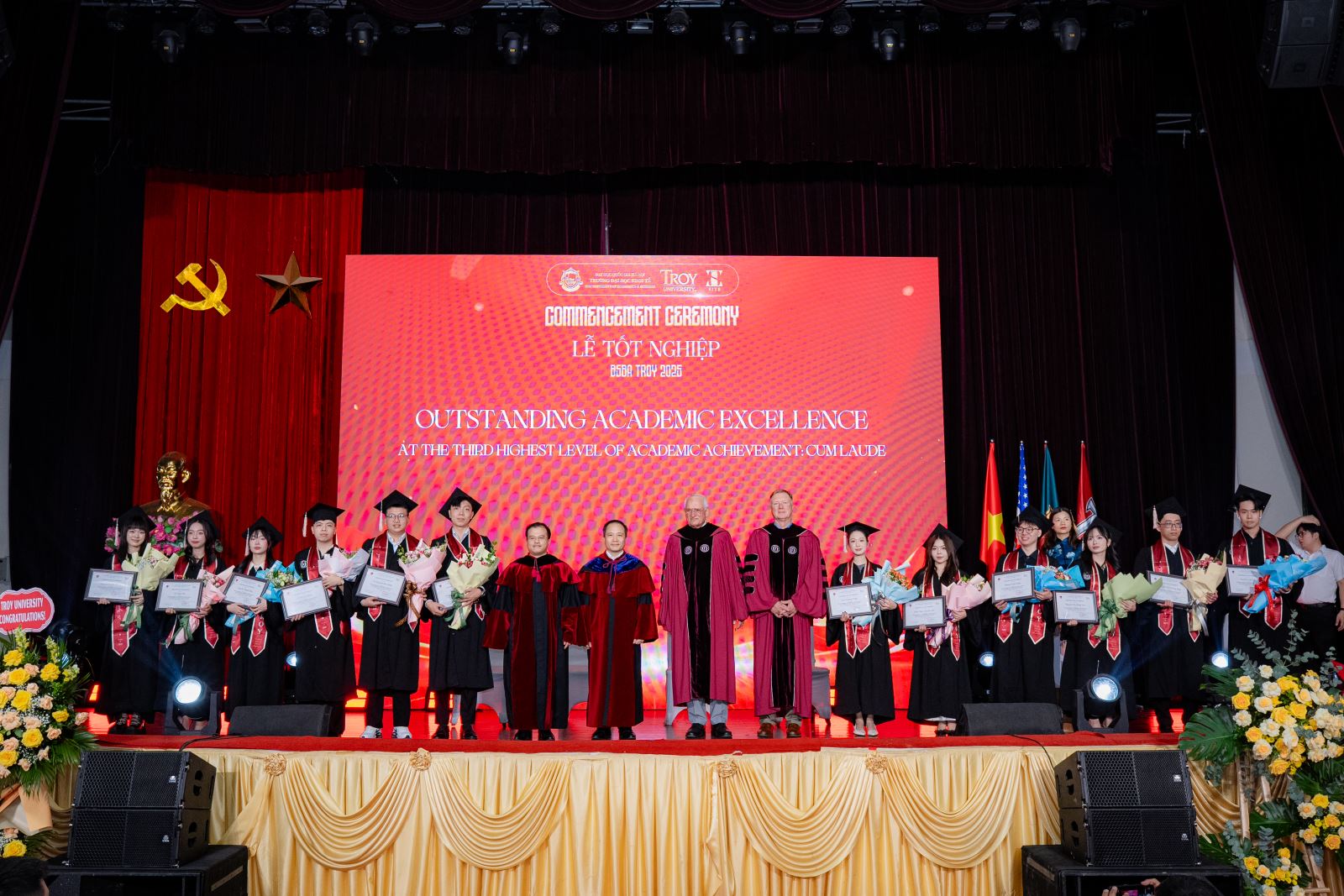 Trong tiếng nhạc trang trọng, từng tân cử nhân bước lên bục vinh danh – tay nắm chặt tấm bằng cử nhân do Đại học Troy cấp, ánh mắt rạng ngời niềm hạnh phúc. Đó là giây phút hội tụ của bốn năm nỗ lực, của những giấc mơ được nuôi dưỡng bằng tri thức và lòng kiên định.