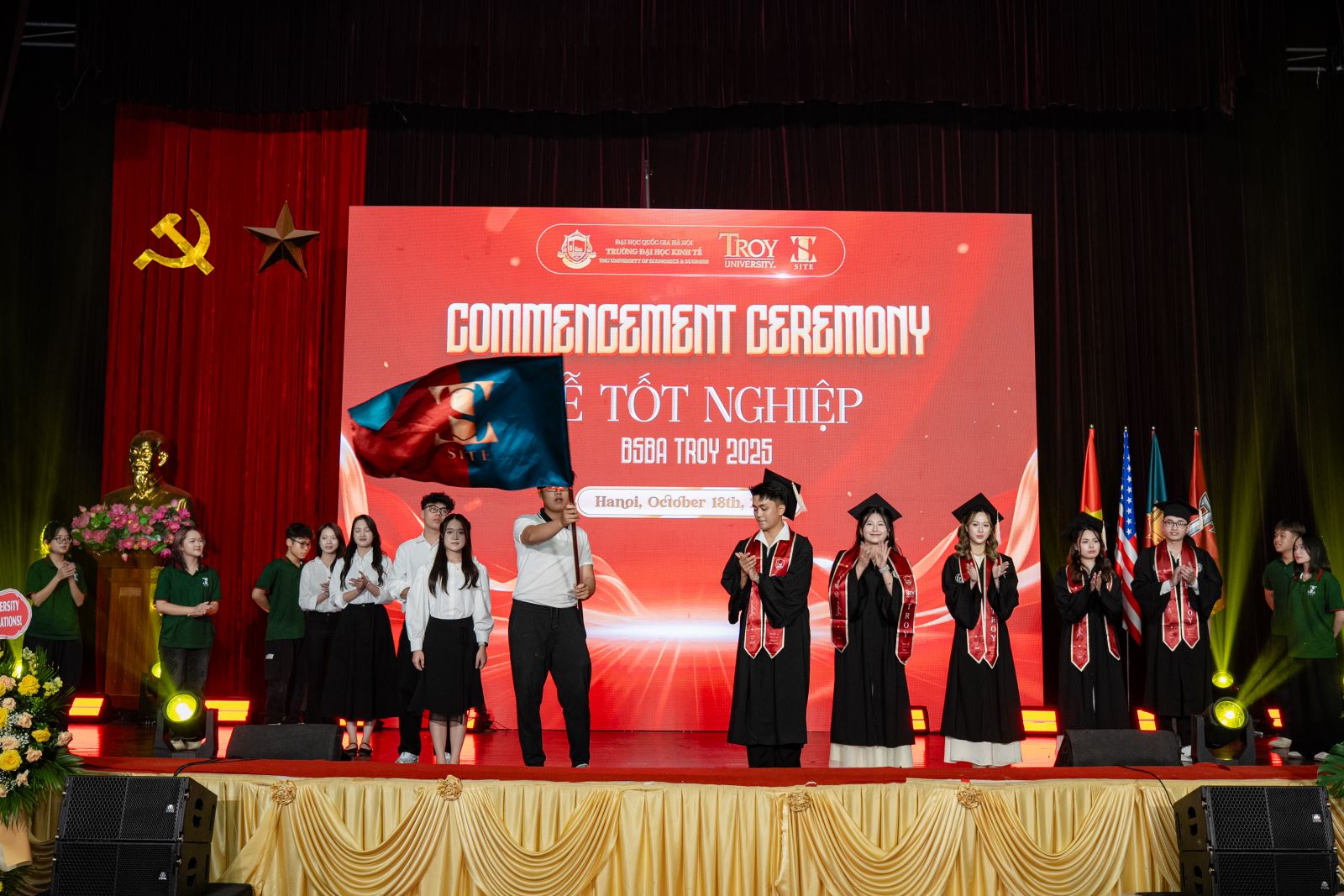 Ở phần nghi lễ tiếp theo, “Passing the Torch” – Truyền ngọn lửa tri thức diễn ra trong ánh sáng lung linh và tiếng vỗ tay vang dội. Đại diện các tân cử nhân Khóa 20 trao lại lá cờ SITE cho tân sinh viên BSBA Troy Khóa 24 – thế hệ tiếp theo của chương trình liên kết đào tạo UEB - Troy. Trong giây phút ấy, hai thế hệ sinh viên UEB-Troy đứng cạnh nhau, kết nối bởi cùng một niềm tin: tri thức là sức mạnh, và sức mạnh ấy phải được lan tỏa.