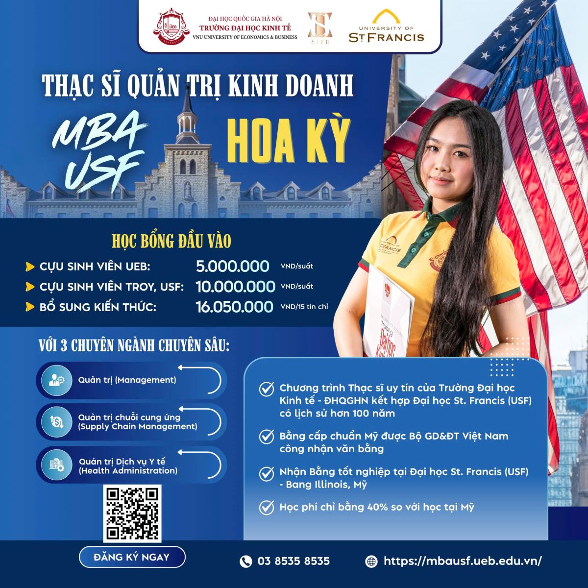 Chương trình Thạc sĩ Quản trị Kinh doanh (Hoa Kỳ) do Trường Đại học Kinh tế - ĐHQGHN (UEB) và Đại học St. Francis (USF) phối hợp tổ chức đào tạo chính là lựa chọn chiến lược để bạn bứt phá sự nghiệp quốc tế, trở thành chuyên gia và lãnh đạo toàn cầu. Khi theo học chương trình, bạn sẽ được học tập với chương trình thực tiễn, rèn luyện trong môi trường đa văn hoá và sở hữu mạng lưới mối quan hệ quốc tế. Có thể nói Thạc sĩ Quản trị Kinh doanh (Hoa Kỳ) không chỉ là một tấm bằng quốc tế, mà là bước chuyển mình mạnh mẽ cho sự nghiệp trong bối cảnh toàn cầu hoá.